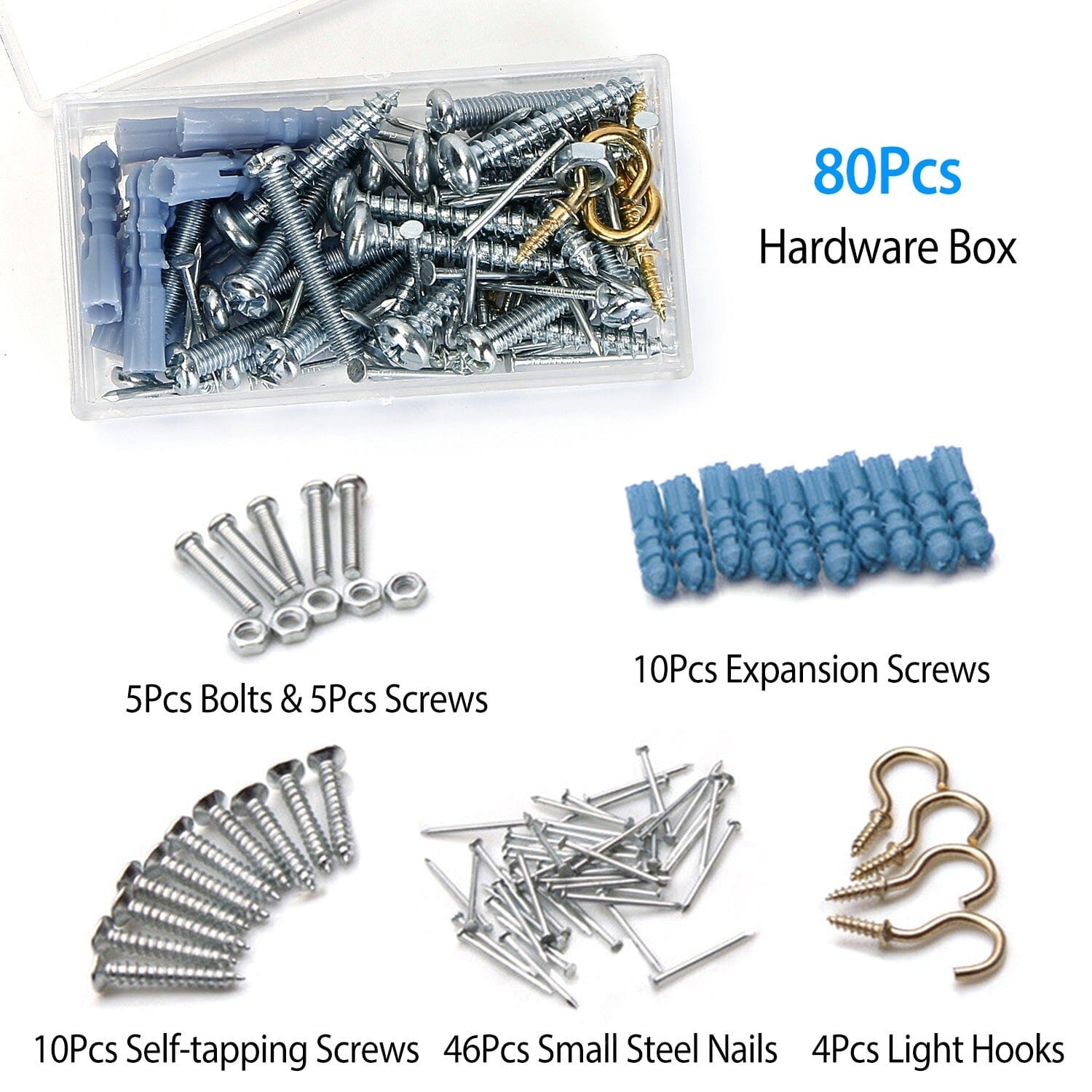 • 80 x Hardware Box (10Pcs ; 5Pcs Bolts; 10Pcs Self-tapping Screws; 5Pcs ; 4Pcs ; 46Pcs )