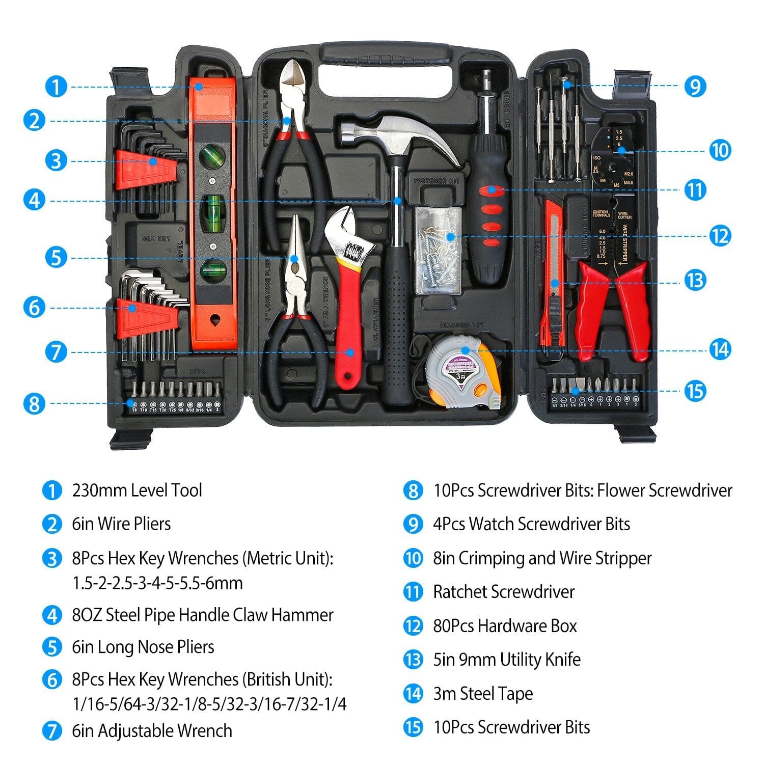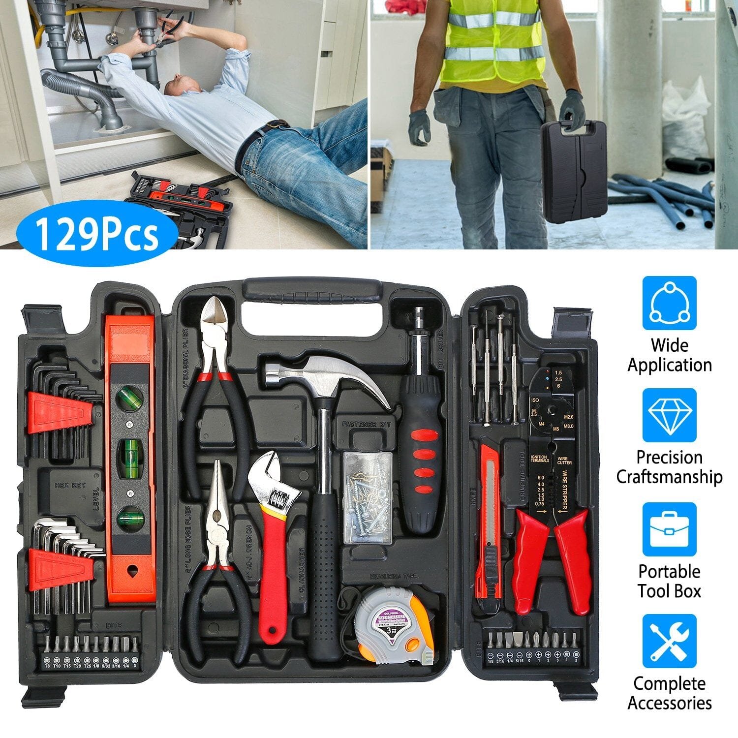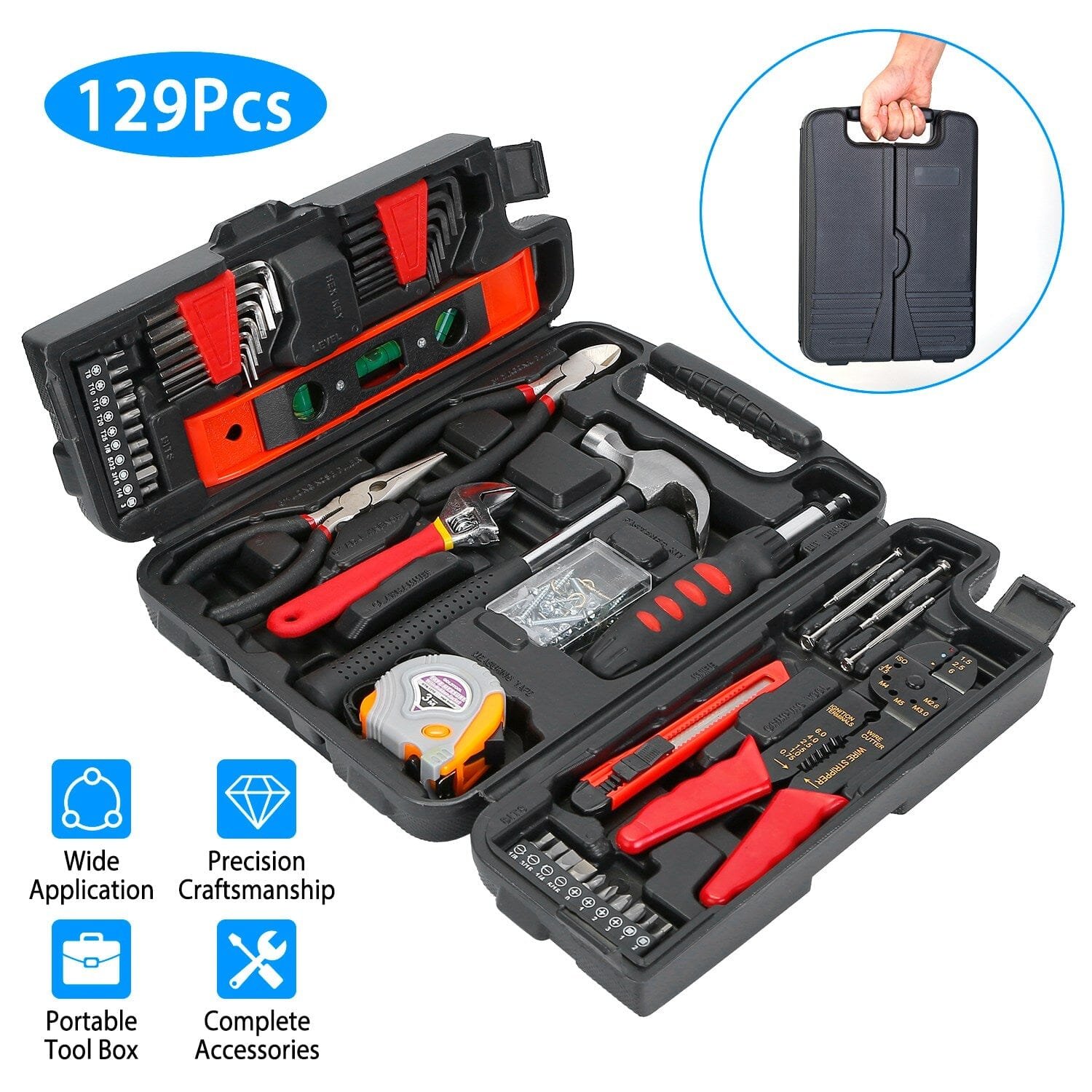 Our Hand Tool Kit includes 129Pcs accessories. such as screwdriver sets. claw hammer and so on. perfect for DIY projects or everyday home improvements. A tool box is provided for you to store and organize them. Made of high-grade steel and plastic. this tool set can be used for a long lifetime.