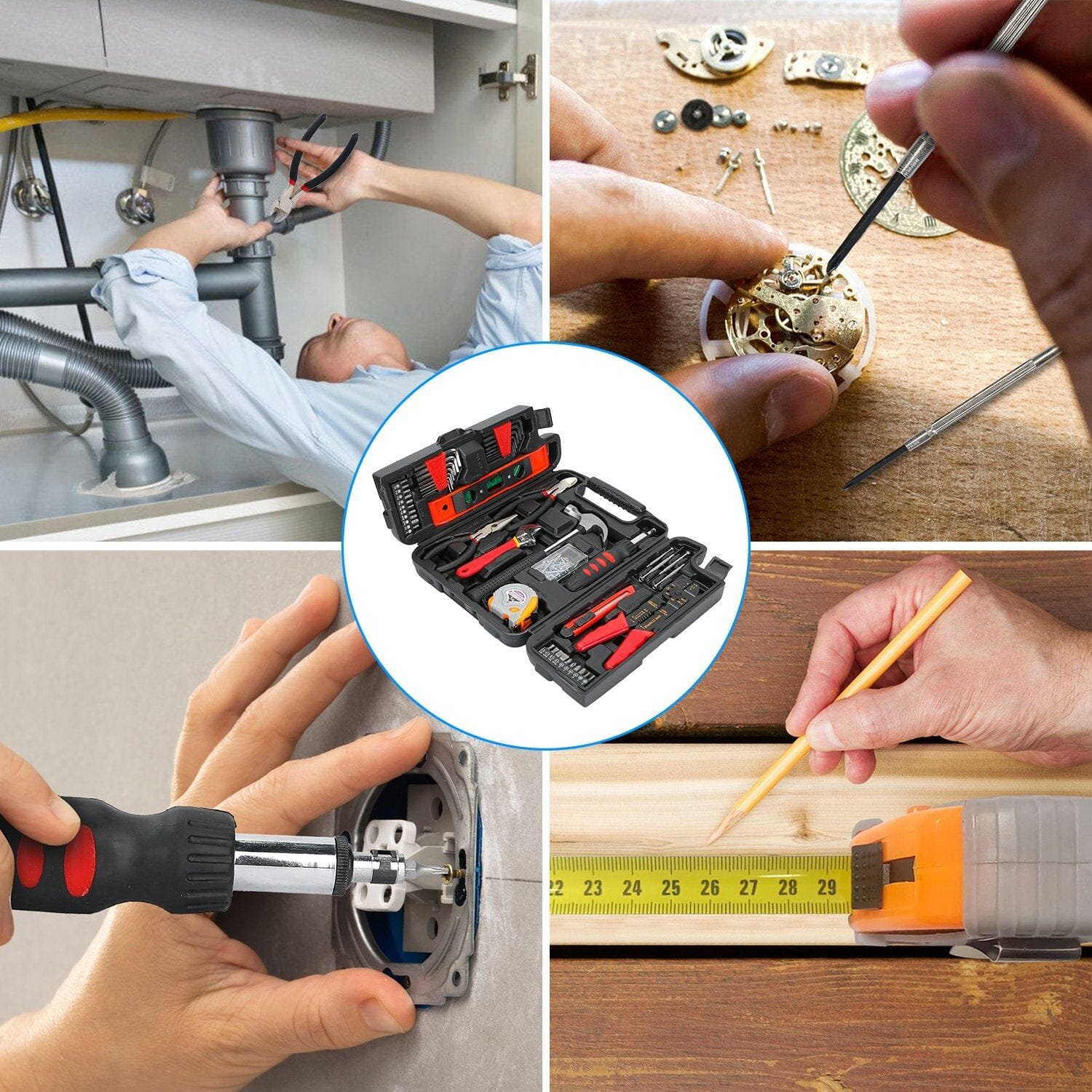 • Convenient Tool Box: Tools are neatly arranged in a sturdy handy molded case to keep them organized and easy to find. The compact carrying case fits your home. apartment. garage. or even the car. You can also hang it on the wall through the two holes on the back of the box.