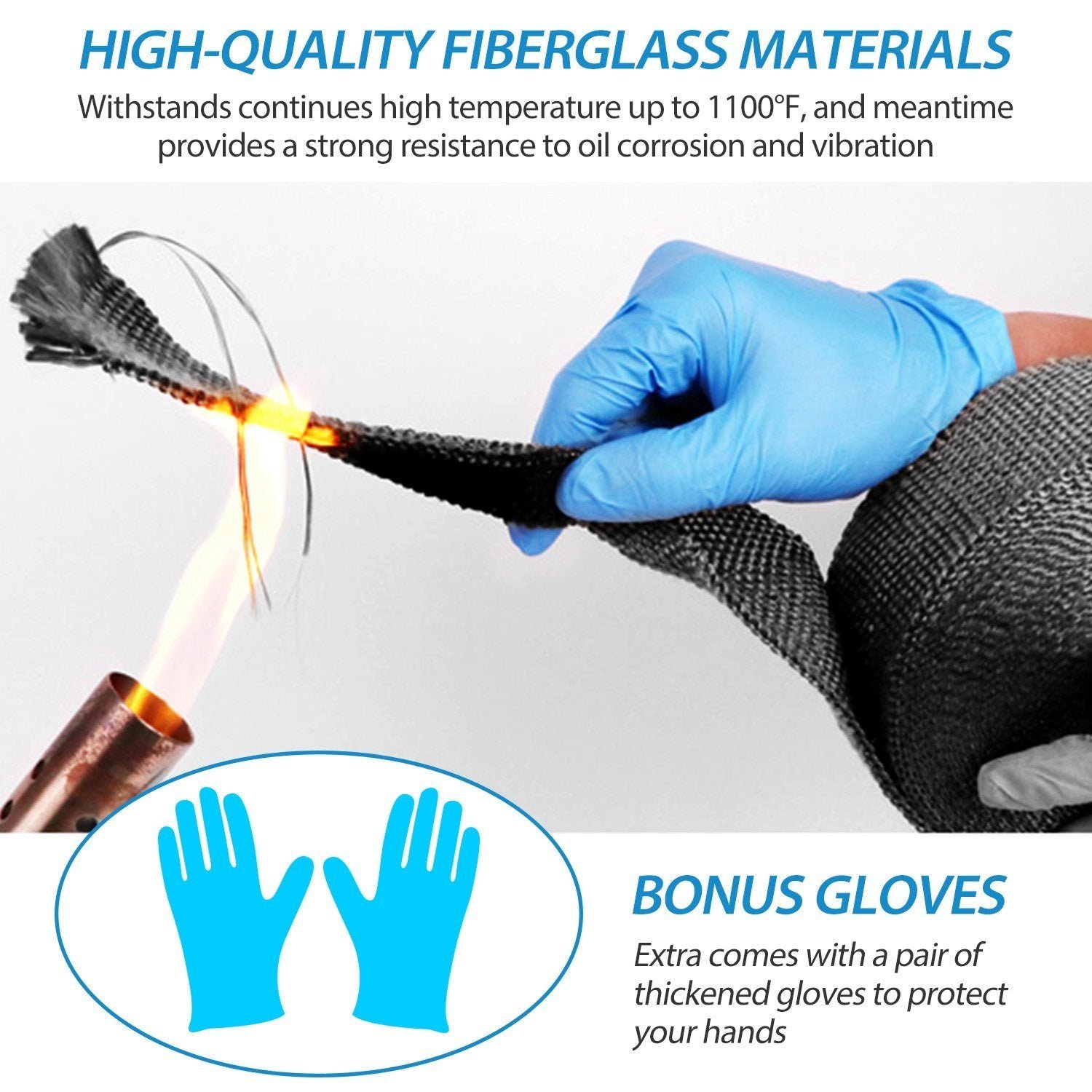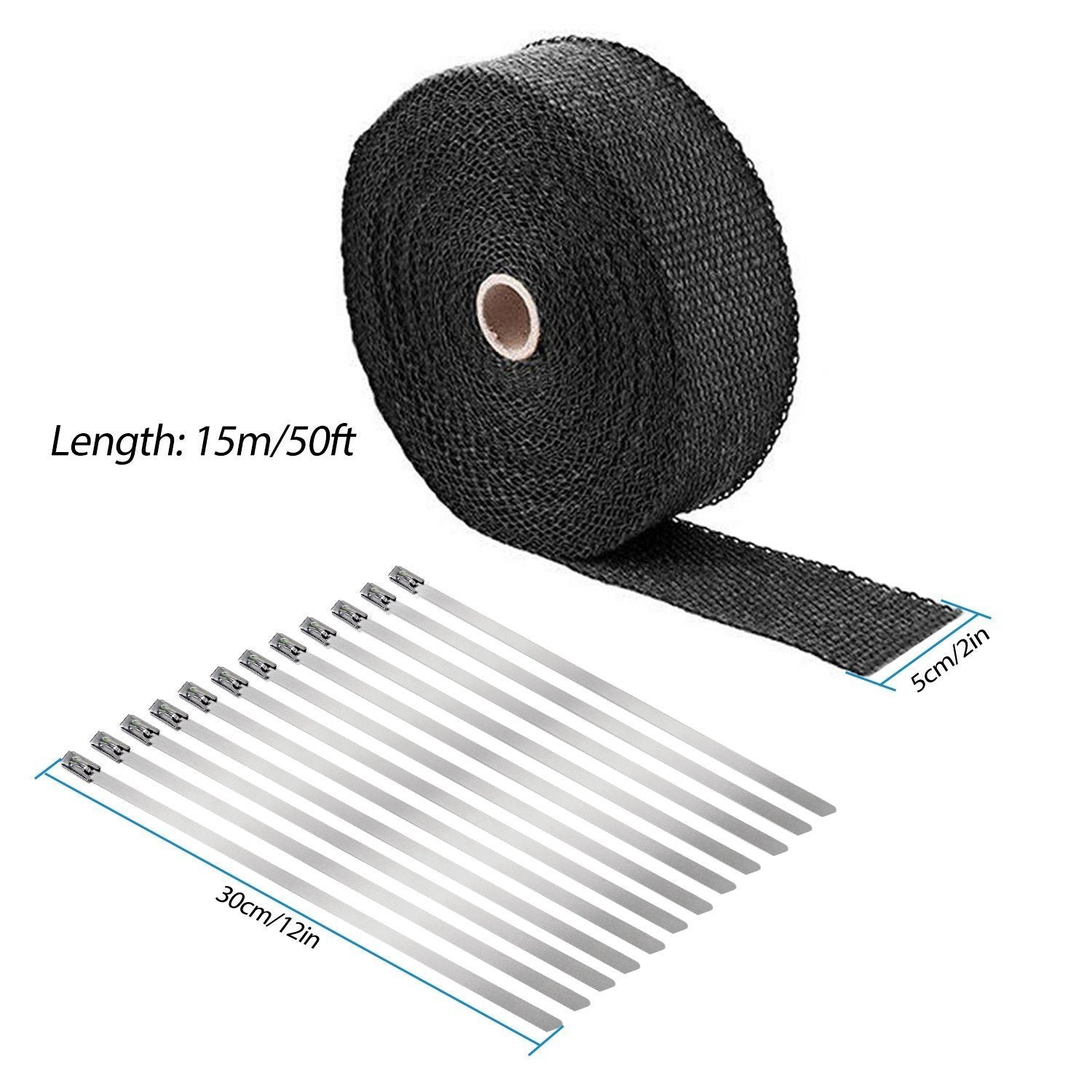 Our 50ft fiberglass exhaust heat wrap tape. featuring high temperature resistant (up to 1100??F). oil corrosion resistance and vibration resistance. can effectively insulate the heat and reduce the noise of engine exhaust manifold and exhaust pipe to improve car and motorcycle performance. Additionally. it comes with 12pcs 12-inch-long stainless steel locking ties to help secure the ends of the tape tightly and a pair of thickened gloves to protect your hands.