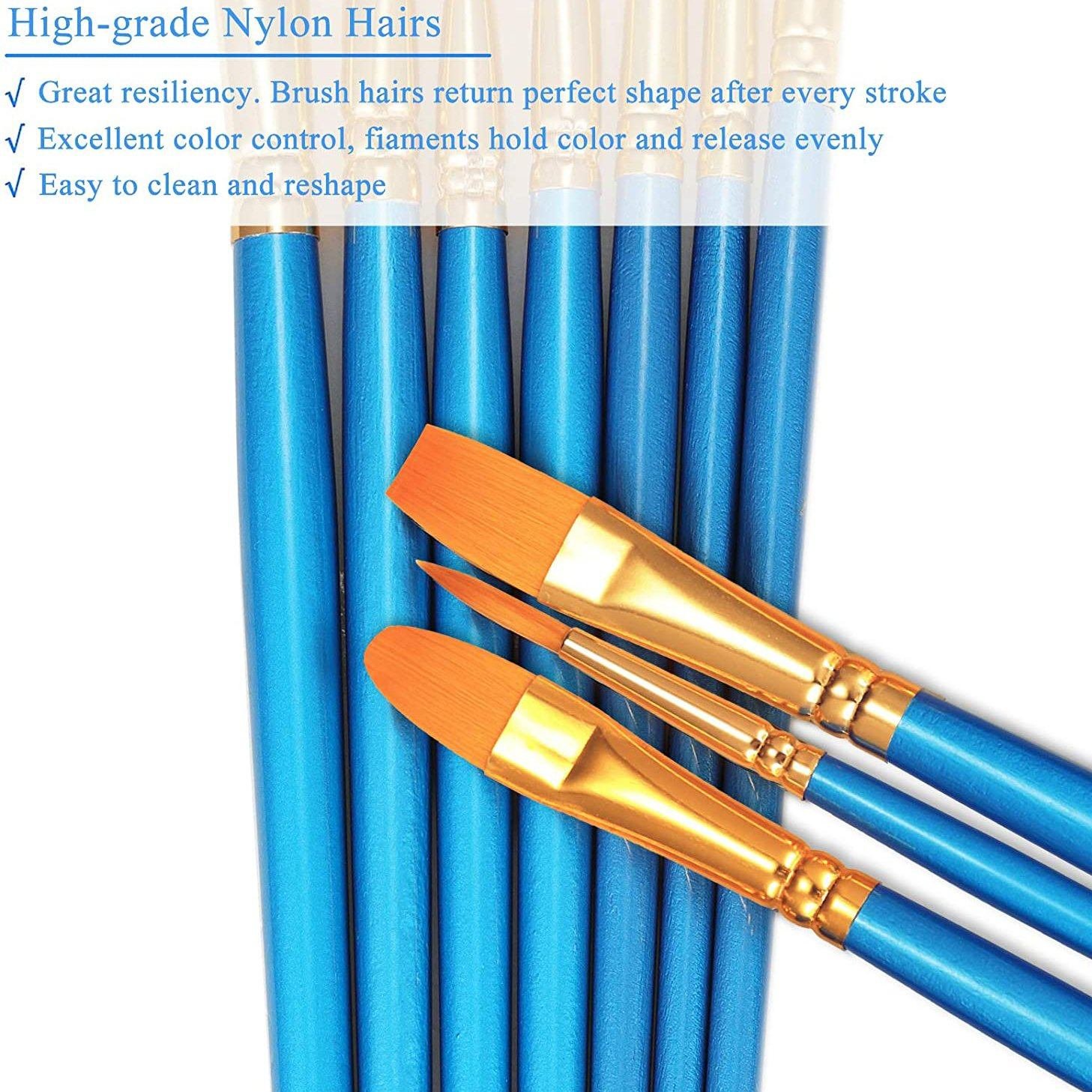 • Warm Tips: Clean your brushes immediately after using them. avoid scrubbing while cleaning. Never leave your brushes resting on their heads in water. solvent. or when drying. Store clean brushes vertically. head-side-up or horizontally. What You Get: 10pcs artist brushes set * 2 and friendly customer service. if you have any question with your painting kit. be free to contact us and we will make it right for you in 24 hours.
