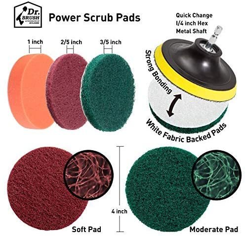 • Drill Cleaning Attachment Set (Brush & Scouring Pads & Scrub Sponge). Includes: 6 shape of Medium drill power scrubber brushes. 9 Piece different stiffnesses Scouring pads. 3 Piece scrub sponge and 4 inch backer.