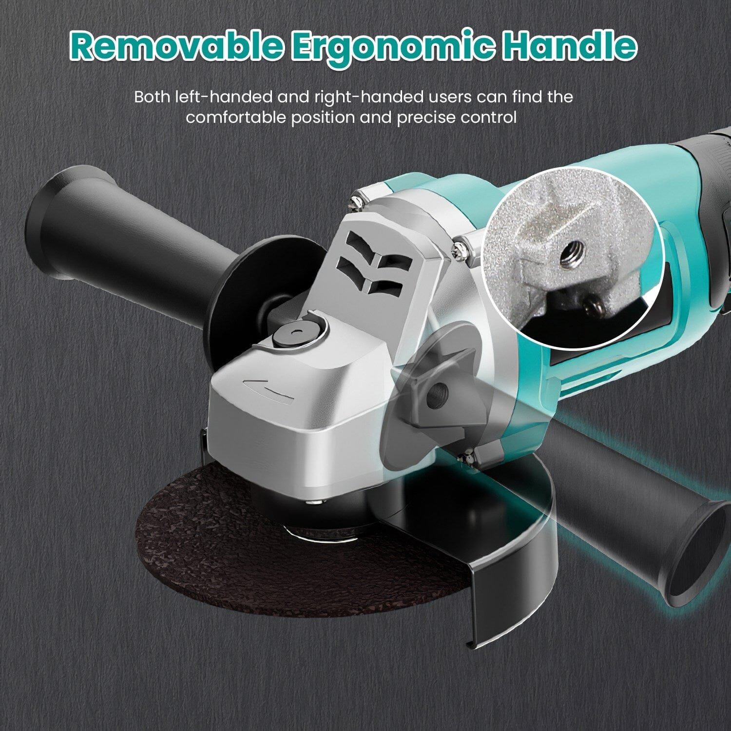 Featuring 3 different rotate speeds. our ultimate cordless electric angle grinder kit brings ease and efficiency to your all materials cutting demands. like metal. steel. tile. and wood. Powered by a robust copper brushless motor. this 21V cordless angle grinder delivers higher efficiency. more stable motivation. and lower noise compared to ordinary motors. With its rechargeable design. this cut-off grinding tool offers convenience and flexibility that traditional corded grinders can’t provide. Dual-position removable handle adapts to your preferred using position. and thickened baffle not only reduces splashes of work piece debris and prolongs the grinder’s service life but also protects you from sparks and metal chips.