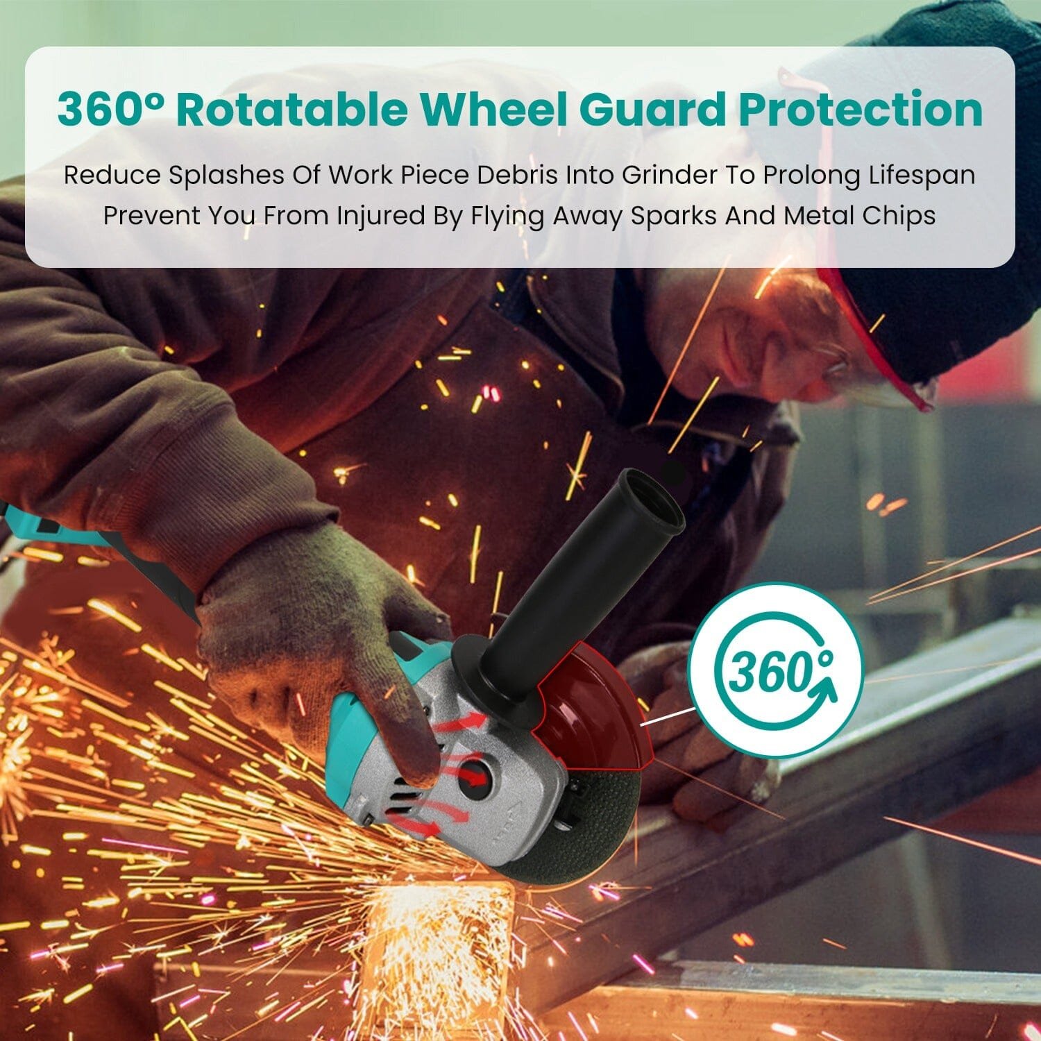 - Dual-Position Removable Handle: The ergonomic handle can be removed to mount on left or right side of the angle grinder. so as to adapt to your different using position. bringing you maximum comfort and precise control. The thickened baffle can not only reduce splashes of work piece debris into the angle grinder and prolong the service life effectively. but also prevent you from injured by flying away sparks and metal chips.