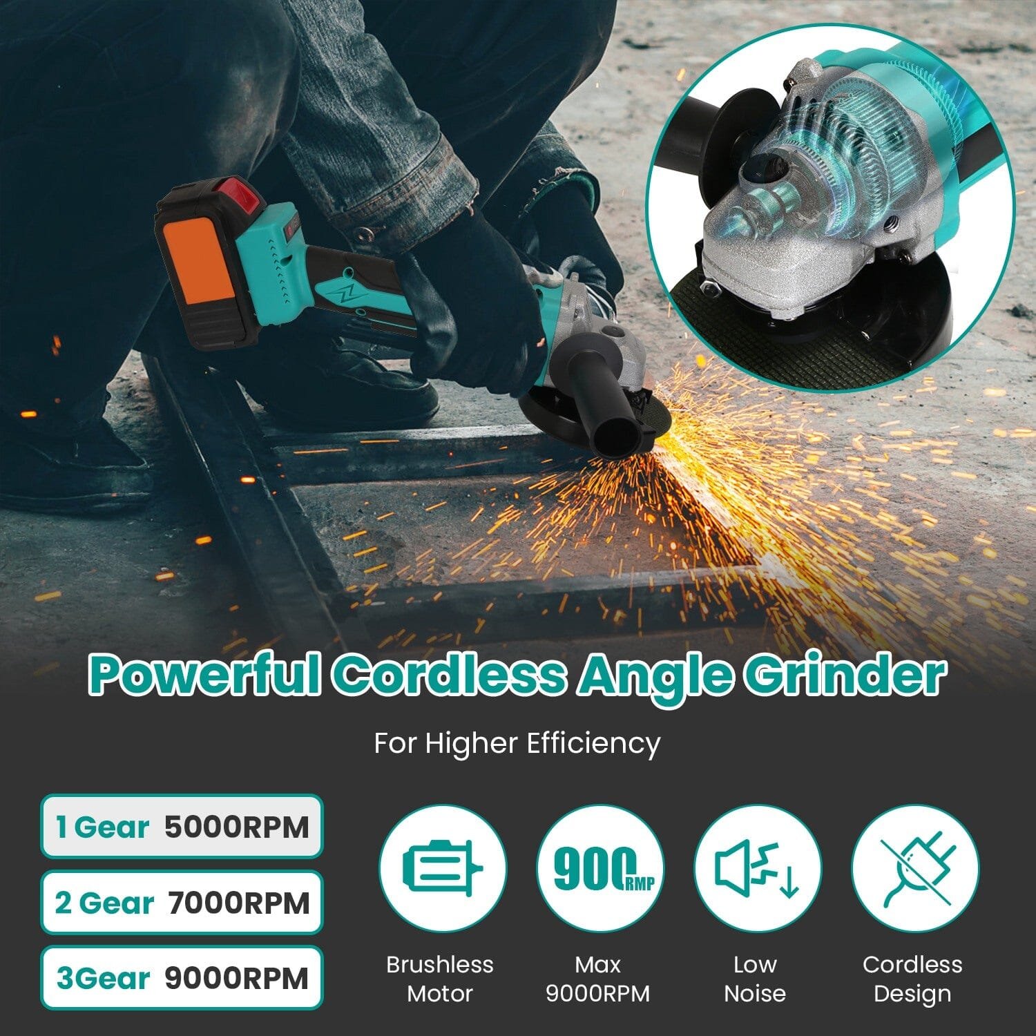 - Powerful Brushless Motor: Adopted powerful copper brushless motor. this 21V cordless angle grinder delivers higher efficiency. more stable motivation and lower noise than ordinary motor. up to 9000RPM no-load speed ensures reliable and productive cutting projects. A practical and efficient assistant to deal with household repair works or professional jobs.