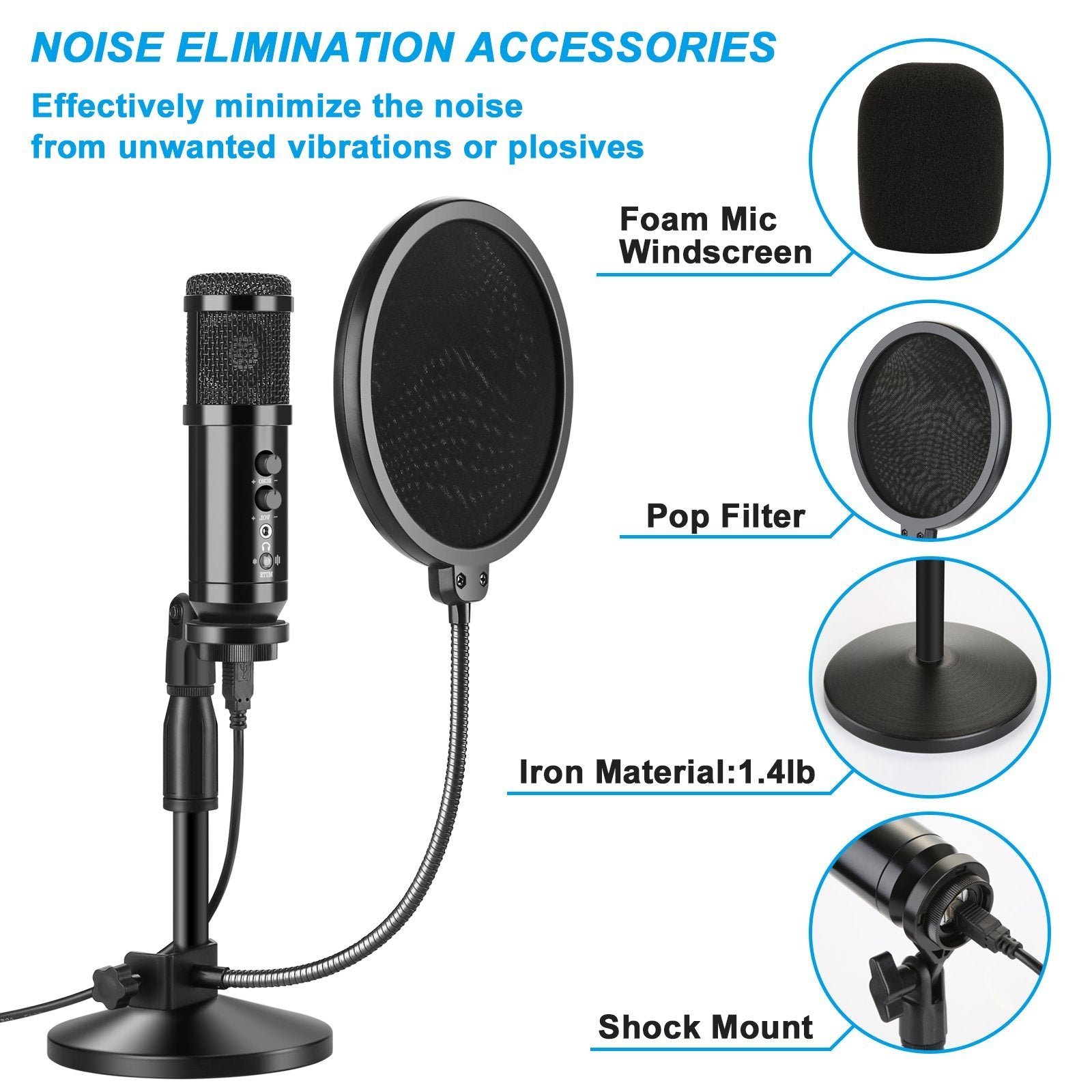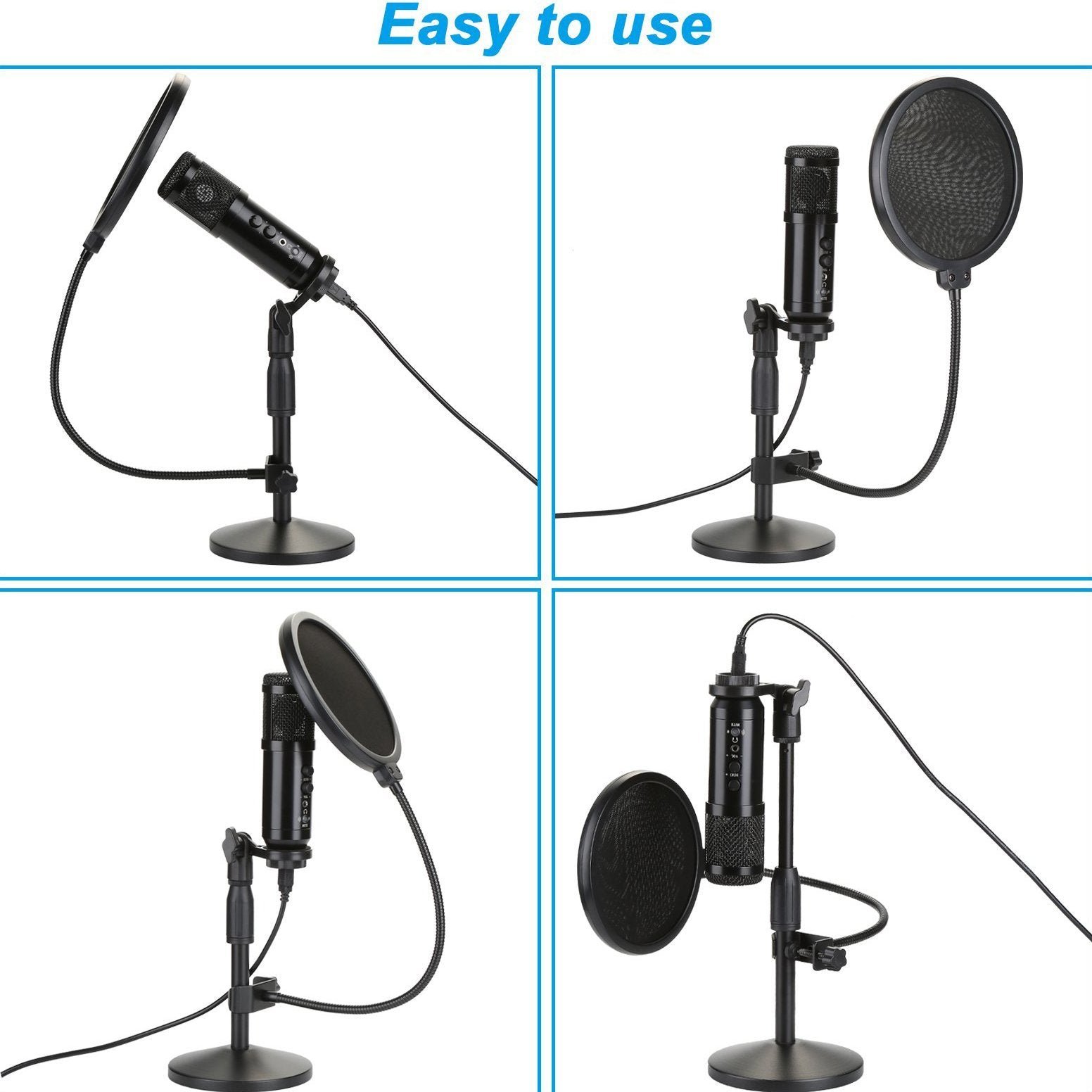 • Earphone Monitoring: Microphones have four function knobs. Key mute/unmute your microphone (Blue Light: Working. Red Light: Mute) and the built-in LED Indicator lights to tell you the working status.3.5mm diameter headphone jack. suitable for public headphones. listening while recording.