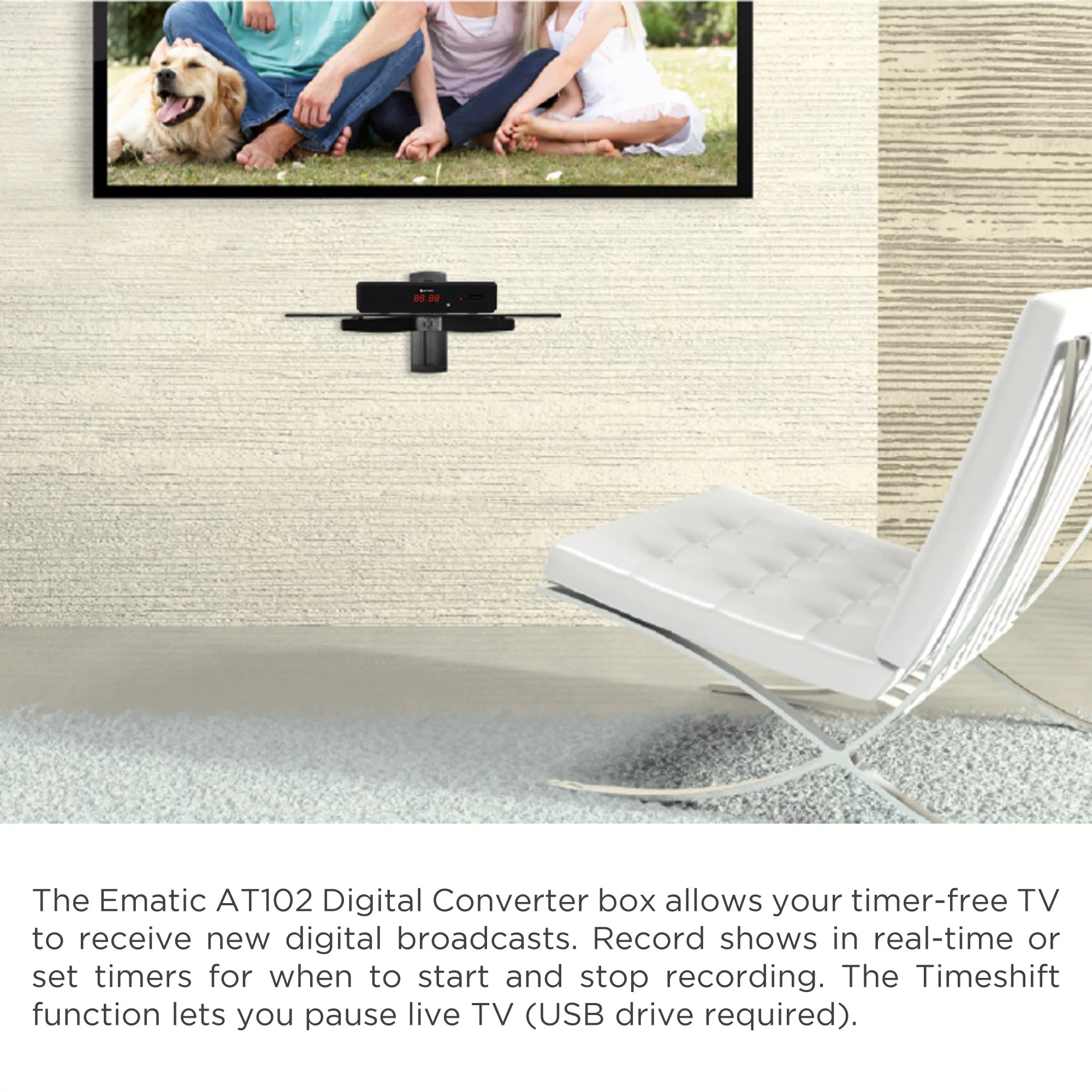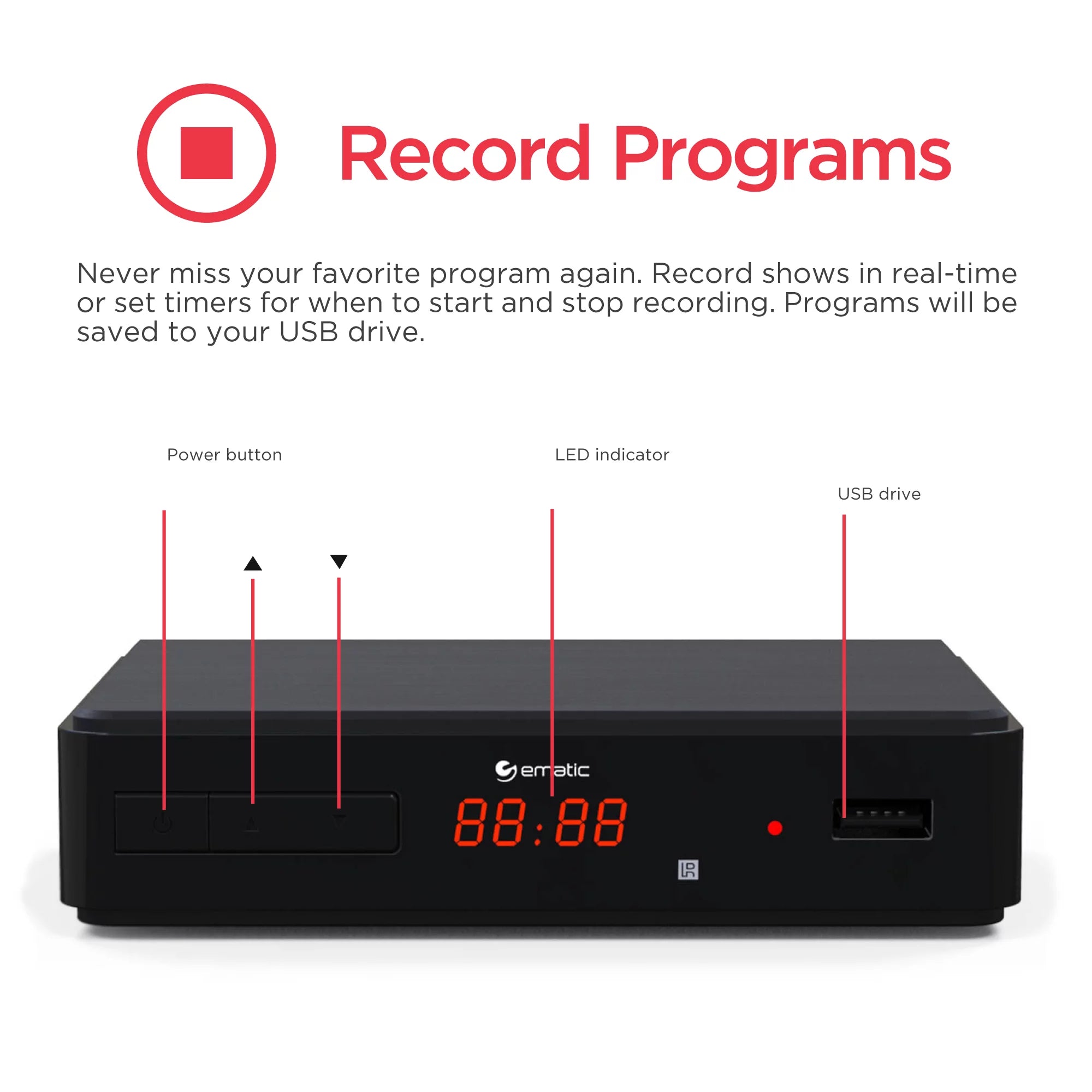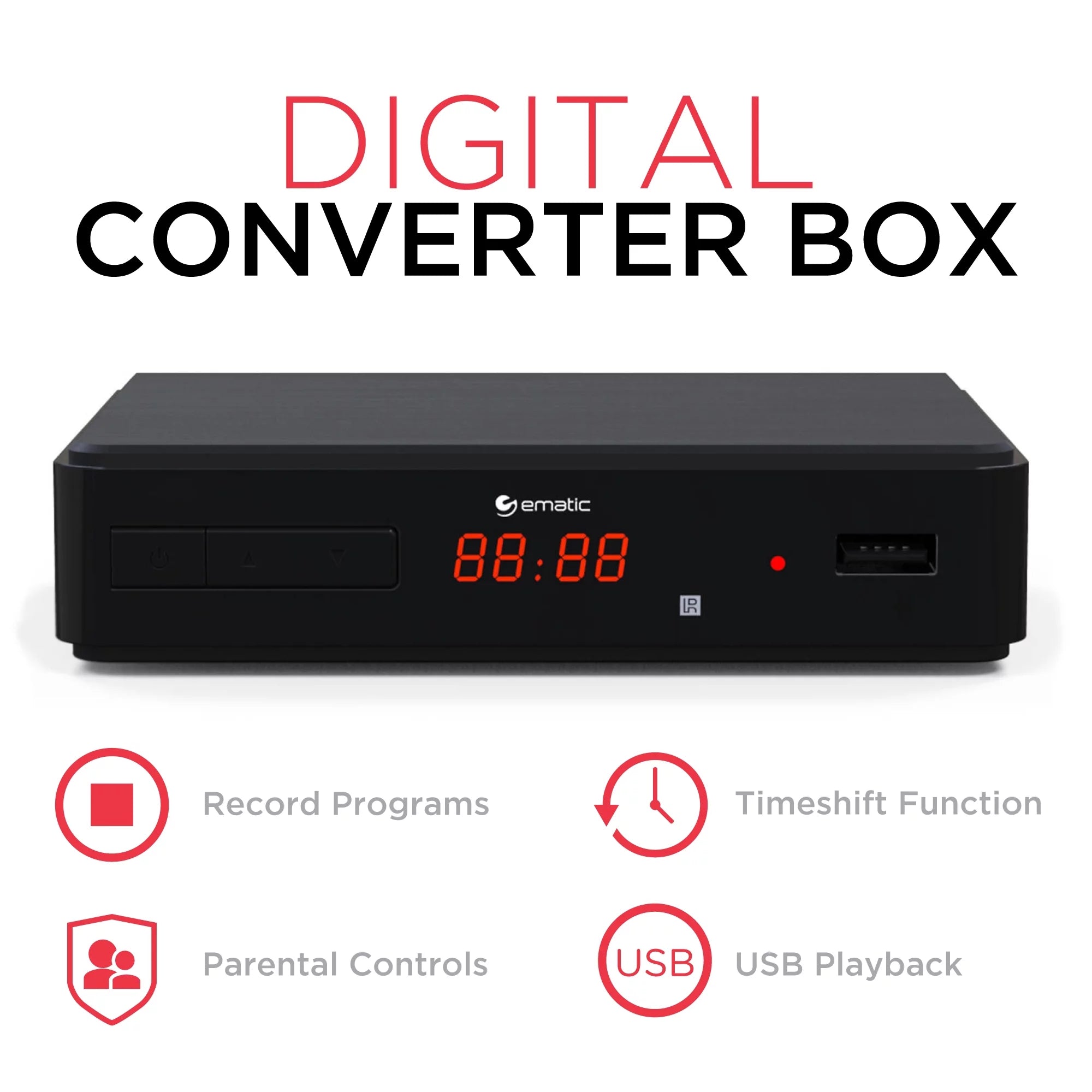 The Ematic AT102B digital converter box + recorder allows your TV without a digital tuner to receive new digital broadcasts. The record shows in real-time or set timers for when to start and stop recording. The time shift function lets you pause live TV (USB drive required). Continue watching from where you paused. skip over boring ads. or skip directly to real-time playback. Connect a USB drive to play movies. listen to music. or view photos. The parental controls let you block channels you deem inappropriate for your children by setting a password. The box includes a full-functioning remote control. This Ematic converter box features an electronic program guide. so your favorite shows are always at your fingertips. This box comes equipped with a USB connection for multimedia playback. so teens can enjoy their individuality by just plugging in. Browse through the information on TV shows with this converter box. so you know what you are watching before you click.