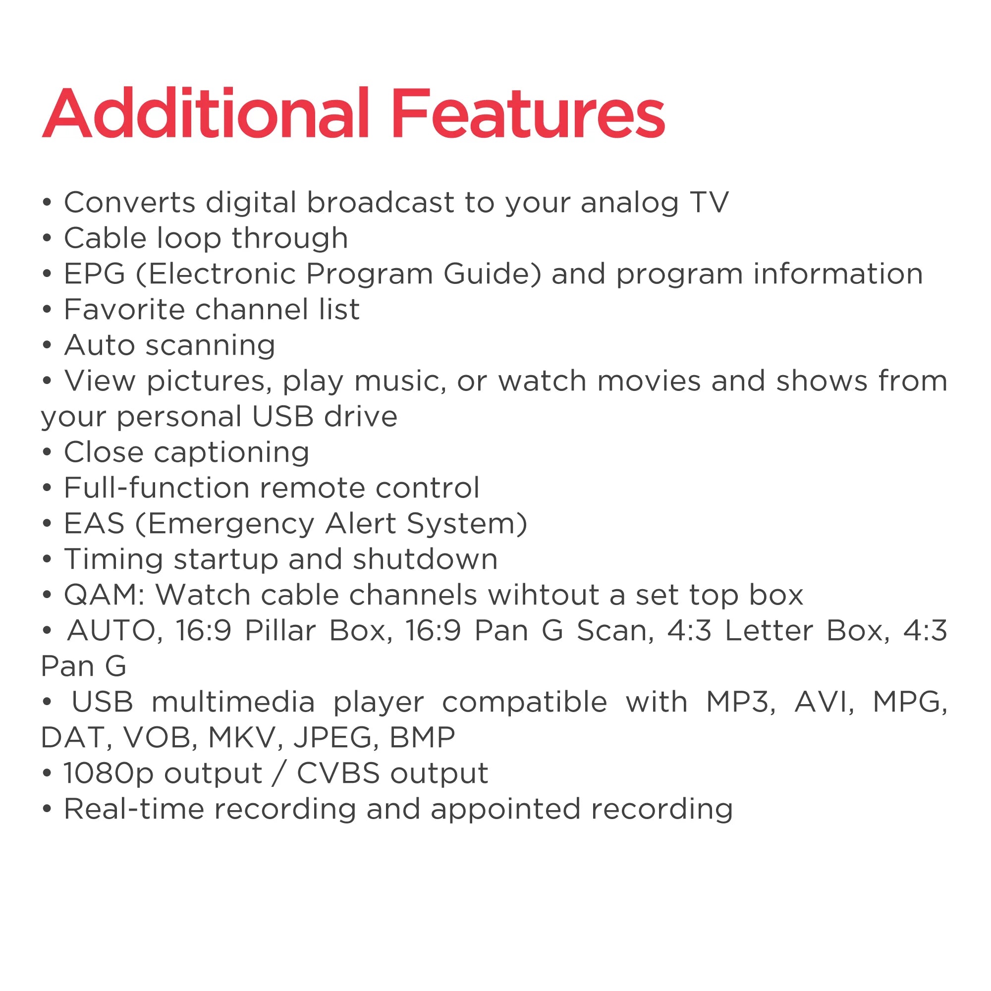 • Converts digital broadcasts to your analog TV
