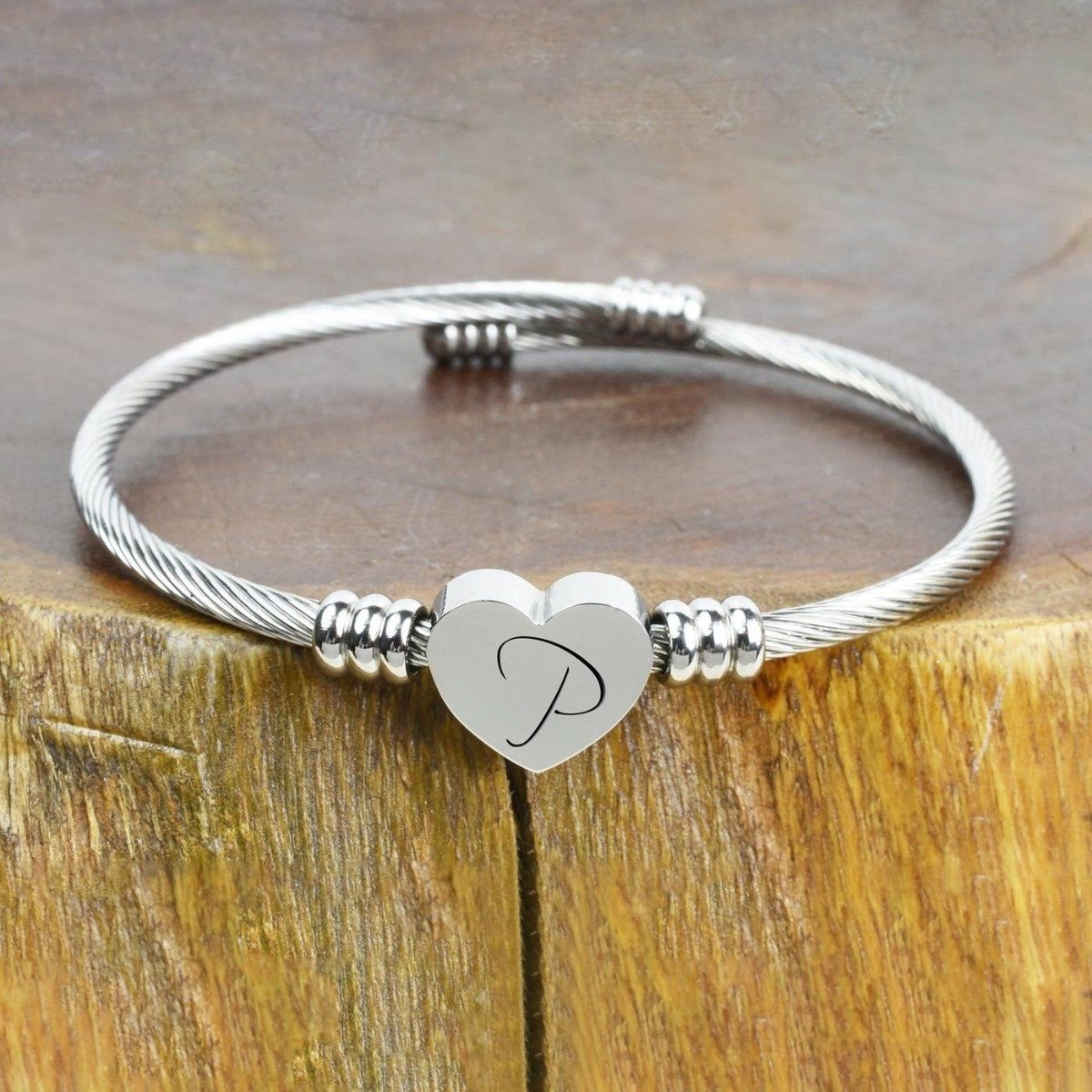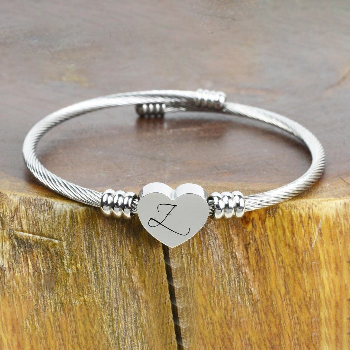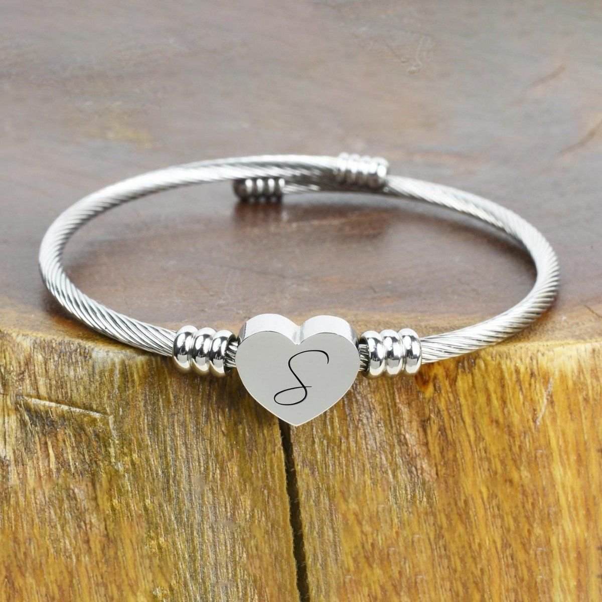 This bangle bracelet featuring a heart-shaped charm has a high polish finish and is adjustable for a comfort fit.