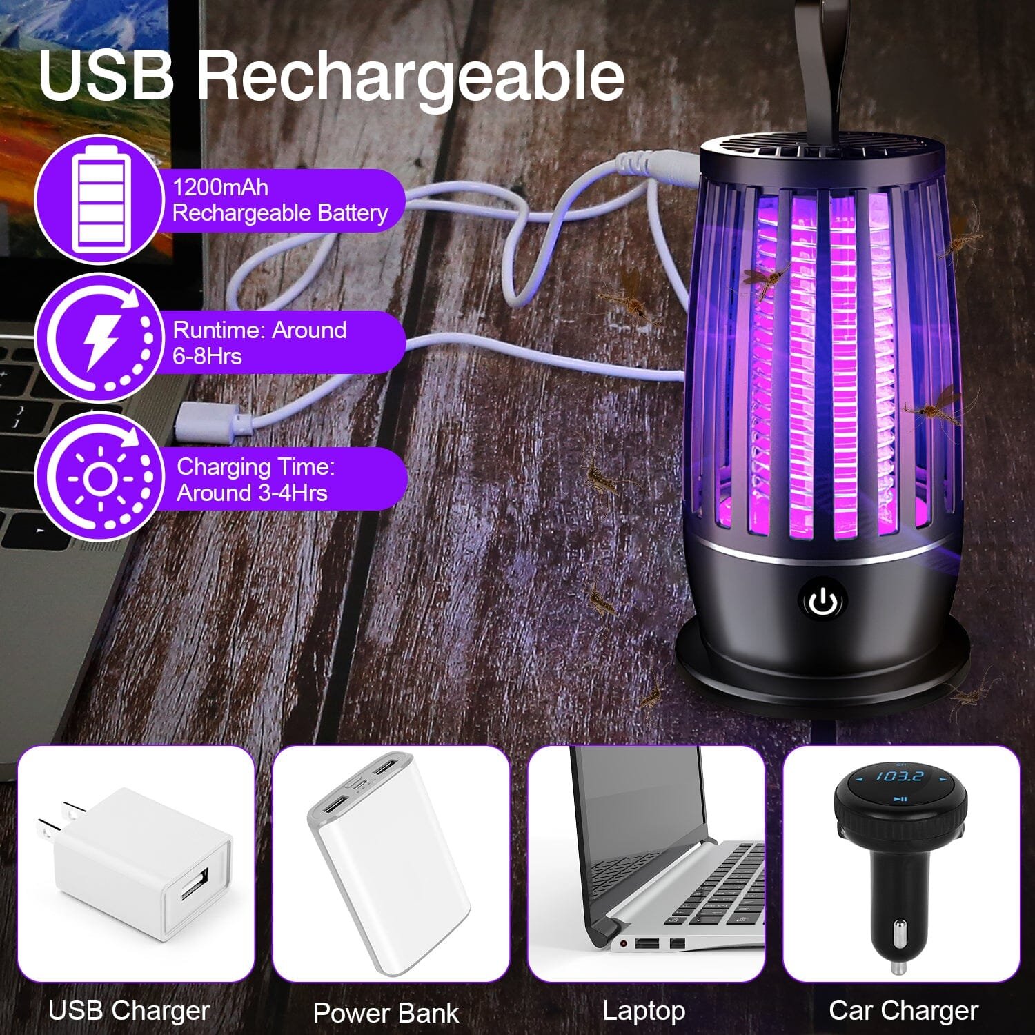 • Rechargeable & Powerful: Featured with a USB cable and 1200mAh rechargeable battery. our mosquito killer lamp keeps standby for 6 hours after 2 hours’ fast charging. Also. the lamp can realize a coverage of 150square meter/1615square feet. effectively protects your family from the annoying mosquitoes.