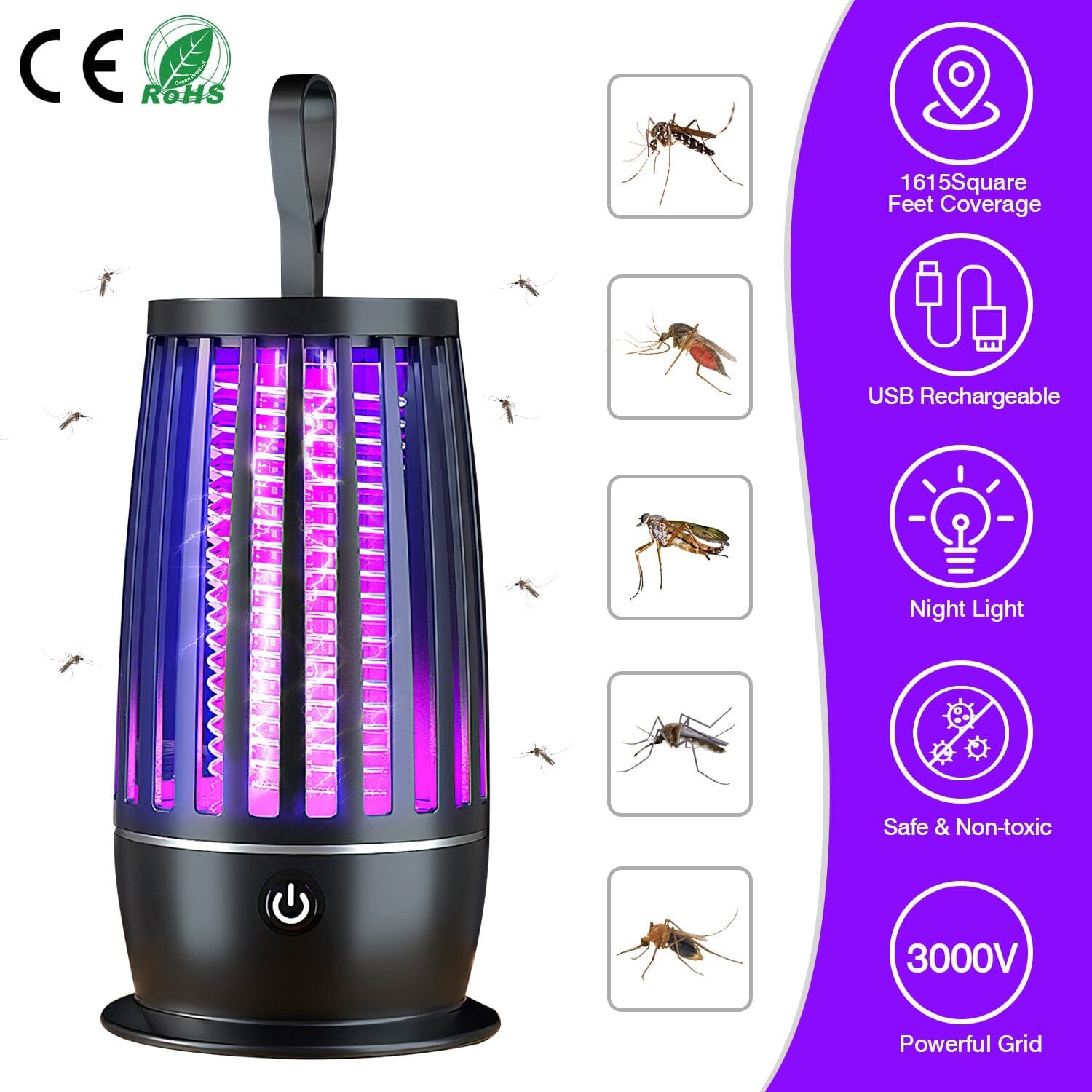 • 360 Mosquito Control: Emit 365nm UV light and imitates human body temperature to lure the annoying mosquitoes. then kill them with electric shock. Finally. the mosquitoes can be electrocuted by the 3000V high voltage.
