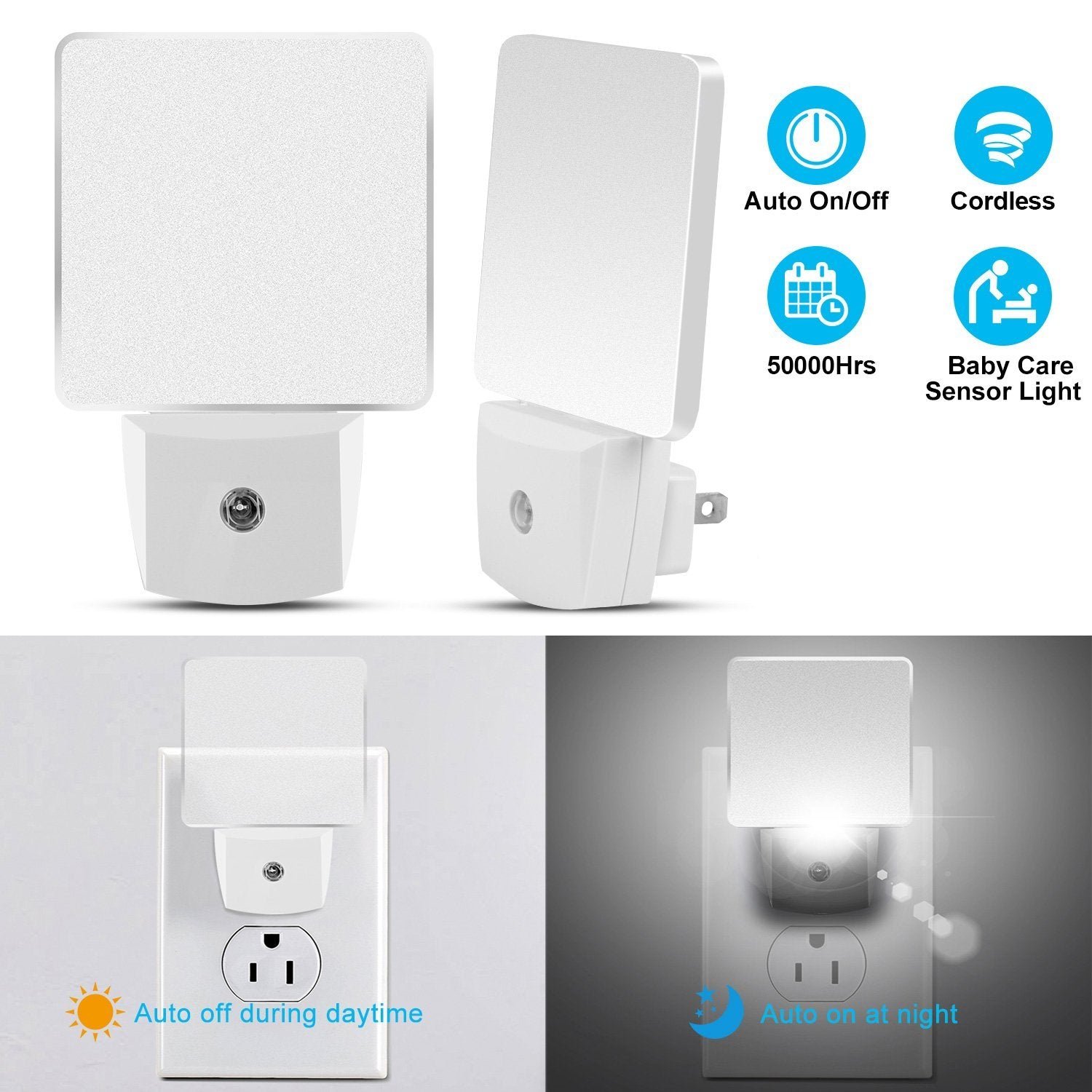 Glared by the main light of bedroom when feed milk to a baby? Disturbed by the high cost of your electricity? Our LED night light will solve these problems. Designed with 0.5W(The brightness is equal to 15W) power consumption and smart dusk to dawn sensor. our night light auto turns on at night/in the darkness and auto turns off during daytime/in the brightness. which protects your safety and cut down your electricity bills. No tumbling. tripping or falling out whether you need to look after your children. use the bathroom. feed the pet or drink some water. Our plugged-in LED light with modern minimalist outlook decorates your home and provides proper light for you. Pro designed for postpartum mother and aged parent at bedroom and bathroom.